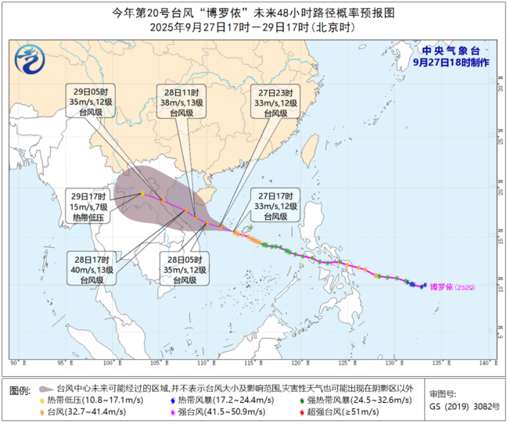 中央气象台预计,“博罗依”将以每小时35公里左右的速度向西偏北方向移动,强度逐渐增强,并向海南岛以南海面靠近,最强可达台风级(35~40米/秒,12~13级),不排除28日夜间在海南岛南部海面加强为强台风级的可能。预计“博罗依”将于28日白天掠过海南岛以南海面,与海南岛最近距离约140公里,28日傍晚到夜间在越南北部沿海登陆。